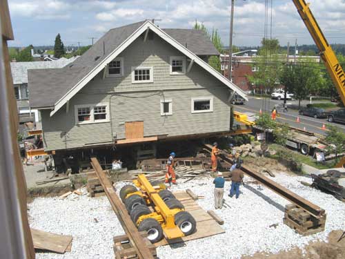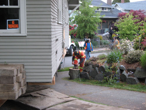 The house was “skated” over to the now vacant lot next door. This way the rockery on the corner could be left intact.
