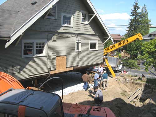 The house ready for moving. There had been several days of digging, raising, reinforcing and other preparation. That’s our yellow house in the background.