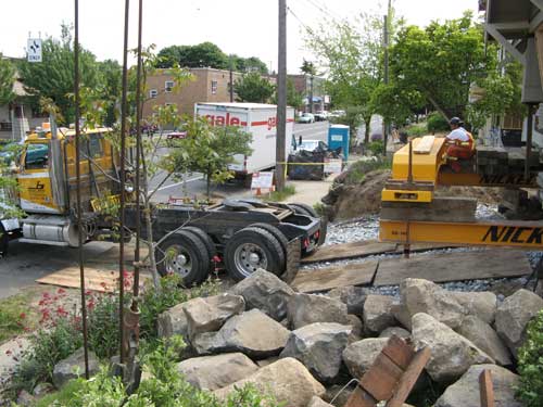 About a hundred people turned out to watch. There were some 15 official vehicles, including crews from various utilities that were there to disconnect cables, streetlights etc. to make room overhead.