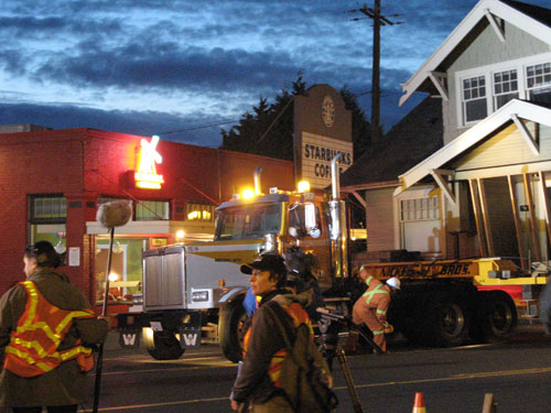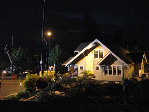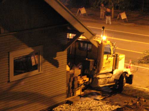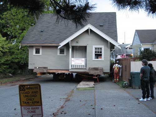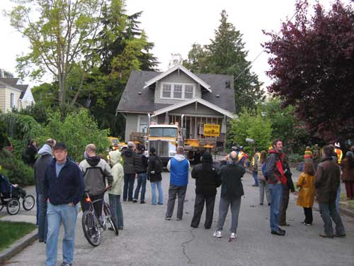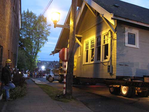 That said, however, it has been a fascinating show. I’ll admit to that. The most fascinating and bizarre act was last weekend, when one of the houses was saved from razing (yay!) and moved to a site about four blocks up the street. About a hundred people turned out at 3AM to accompany it to its new home. Here are a few pictures, click the thumbnails for a larger image.